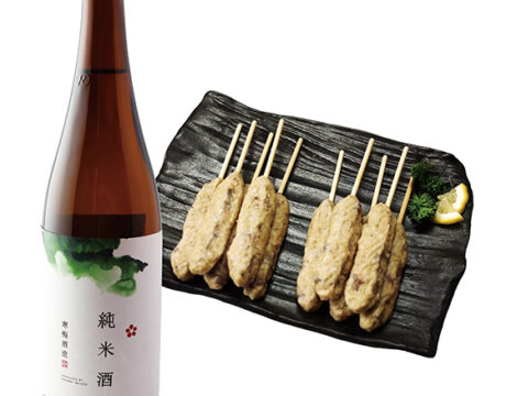 すっきりとしたのど越しの『寒梅酒造 オリジナル純米酒』と粗挽きの程よい歯ごたえと牛たんの風味が美味しいつくねのセット