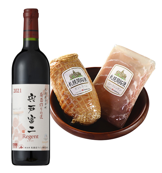 おいしいハムとともに楽しみたいワインをご紹介。北海道余市といえば、実はワイン用葡萄の収穫量が北海道でナンバーワンを誇る一大生産地です。「葡萄作りの匠」宍戸富ニ氏の作り上げた葡萄で造るワイン『宍戸富ニレゲント 赤』。余市川近くで栽培されたドイツ原産の品種レゲントが使用され、上質な渋みとほど良い酸味のある深い味わいのミディアムボディタイプの赤ワインです。
