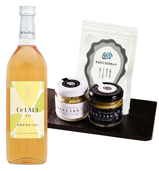 『かきジャーキー』は、江田島産牡蠣の貝柱とヒモを使ったジャーキー。乾燥させることで、凝縮した牡蠣の旨みとほどよい塩味が噛むほどに広がります。『CeLALA 白』の香りが際立ち、牡蠣の余韻と軽快な酸味が奥深いハーモニーを奏でます。牡蠣と白ワインの上質な旨みを堪能できるギフトセットです。
