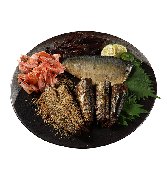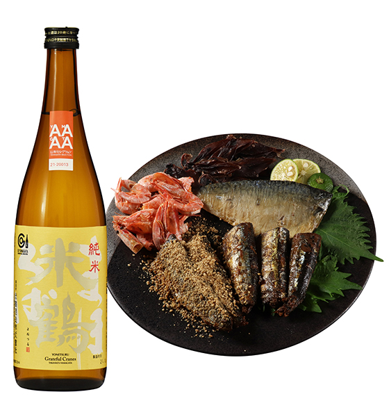 骨まで食べられるほど柔らかな『国産さんまの佃煮』は、肉厚な身を無添加の自社特製タレで煮込み、旨みを際立たせています。『金ごま真いわし』は、好みでかける金ごまの豊潤な風味が国産いわし佃煮の旨味を引き立て、『米鶴 純米 まほろば』のキレが増すペアリング。『石巻寒さば骨まで食べられる塩さば』は、宮城県石巻漁港産の寒さばを、こだわりの塩のみを使い高温で焼き上げました。噛むほどに旨みと香りが広がります。『そのまんま甘エビ』は、香ばしい国産赤エビの甘みと肝の風味を楽しめます。『日本海産ホタルイカ姿干』は、船凍凍結した新鮮なホタルイカを、低温で乾燥。少しあぶると香ばしく、肝がとろりとなって香りも強まり、噛むほどに味わいが広がります。『米鶴 純米 まほろば』の香りとの余韻を、ゆったりとご堪能ください。