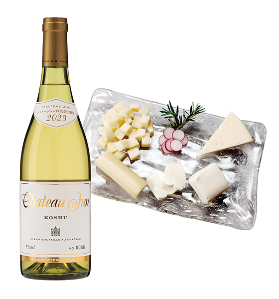 香り高い4種のチーズとペアリングするワインは、ファッションメーカー「JUN」の傘下にある山梨県 勝沼のワイナリーシャトージュンの辛口白ワイン「甲州」です。シャトージュンの代表作となる甲州ぶどうから造られた白ワイン「甲州」は、収穫されたぶどうを低温発酵で風味をそのまま再現した甘い香りが特長。果実を思わせる香りと甘みと酸味が調和する辛口のワインです。国際的なワインコンペティション「International Wine Challenge 2024( インターナショナルワインチャレンジ)」にて銅賞受賞。過去には2018ヴィンテージが、G20大阪サミット首脳夕食会にて提供された実績もある銘柄です。
