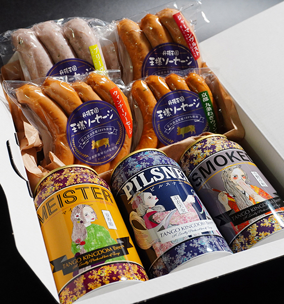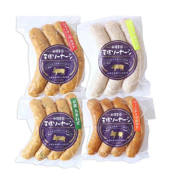 そのクラフトビールのお供におすすめなのが、同じく株式会社丹後王国ブルワリーで製造されたウインナーのセットです。保存料は使用せず、お肉の旨みを生かすため、丹後で作られた「琴引の塩」と「京丹波高原豚」のみを使用したシンプルなウインナー。試行錯誤を繰り返して完成された職人こだわりの逸品です。お肉の旨みを存分に味わえるプレーンなウインナー『ウインナーヴルスト』。ガーリックや玉ねぎが効いた食べ応えのある『ジャーマンヴルスト』、レモンやパセリが爽やかな『ブリーヴルスト』、京都の伝統野菜「九条ネギ」を使用した『九条ネギウインナー』の全4種類をご用意しました。