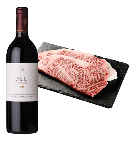 『メルロ樽熟成』にマリアージュするグルメは、兵庫県神戸市にある牛肉卸の老舗、帝神志方ミート株式会社の神戸牛をご用意しました。帝神志方ミートの神戸牛は、豊かな自然環境と丁寧な肥育により、肉質はきめ細やかで、脂は上品な甘味と香ばしさを持つ兵庫県但馬牛の血統を守り抜いた由緒ある和牛。『神戸牛サーロインステーキ』は噛むほどに赤身の濃厚な味わいと芳醇な香りが口いっぱいに広がり、とろけるような食感に包まれます。脂は人肌で溶けるほど融点が低いため、あっさりとして軽やかな後味が特長です。サーロインステーキの旨味に、『メルロ樽熟成』の柔らかな渋みと果実の甘さが重なり、味わい深いマリアージュを堪能いただけます。