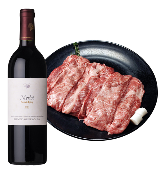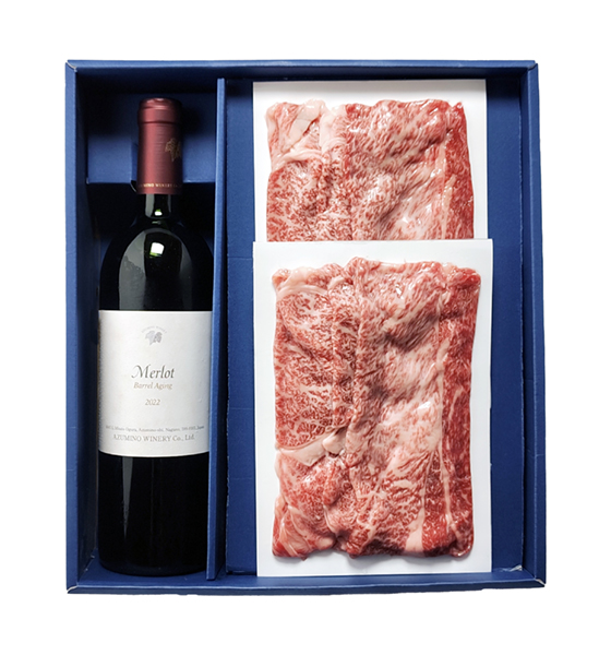 『メルロ樽熟成』の持つ果実味と樽熟成による穏やかな樽香が、すき焼きの割り下と調和し、口の中でとろける神戸牛の旨みを一層引き立ててくれます。それぞれの美味しさをたっぷりと楽しめる贅沢なセットは贈り物におすすめです。