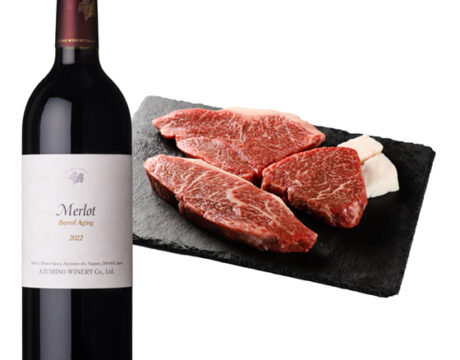 北アルプスの麓、長野県安曇野市のワイナリーが醸す『メルロ樽熟成』と由緒ある『神戸牛網焼肉』のセットは贈り物におすすめです。
